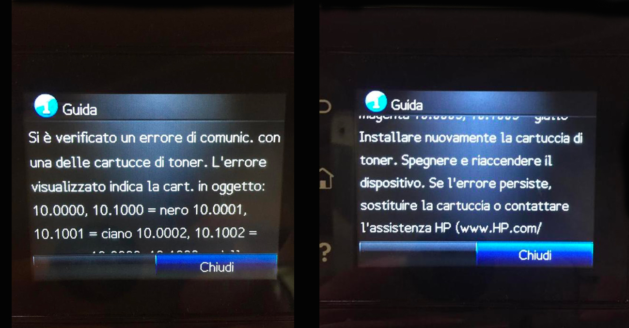 - Il chip è posizionato correttamente ma l’errore persiste. Questo può significare che il chip della cartuccia non è aggiornato. Di conseguenza raccomandiamo di contattare il fornitore della cartuccia per aggiornare il chip, oppure, cambiare la cartuccia.