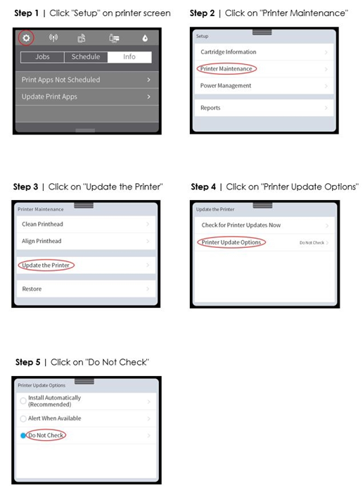 Questi passaggi sono una guida generale su come interrompere gli aggiornamenti e perché è opportuno farlo; ma si noti che varieranno leggermente a seconda del modello esatto della stampante. Consulta la figura 1.
