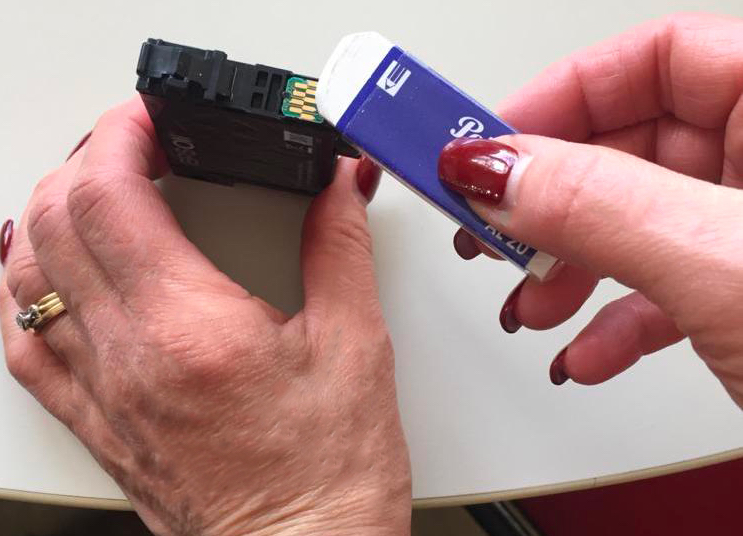 Se al termine dell’installazione di una nuova cartuccia si ottiene una segnalazione di “Cartuccia Non Riconosciuta”, suggeriamo di prelevarla dal suo alloggiamento e con un panno-carta morbido pulire delicatamente la superficie del microchip per rimuovere eventuali tracce di sporco o di ossidazioni che potrebbero impedire una corretta connessione con la stampante. E anche possibile utilizzare una gomma morbida da matita, come mostrato in figura 1.