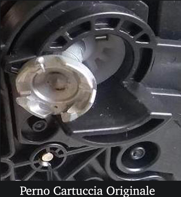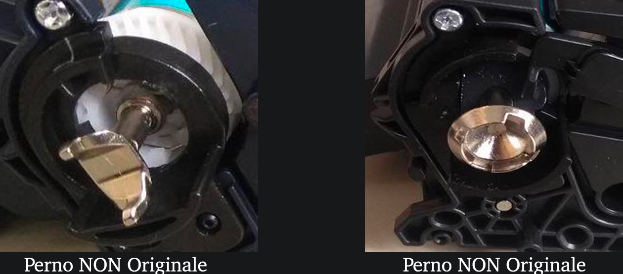 Oggi sul mercato si possono trovare cartucce toner che presentano perni dalla forma e dall’aspetto differenti. Questo è dovuto all’attività di ricerca e progettazione dei produttori indipendenti, al fine di poter offrire toner e drum non lesivi dei patent e nello stesso tempo correttamente funzionanti nelle rispettive stampanti. Eventuali differenze dunque non devono preoccupare (figura 2 con due esempi di perni non originali).